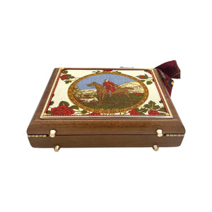 Details include: Mahogany cigar box, skinny scarf, tassel dangling from burnt bamboo handle, and acid-protected hardware (clasp, hinges, and purse feet) have been added. Interior is finished with a velvety liner, pocket, and small mirror. The box is a durable, sable-stained mahogany.