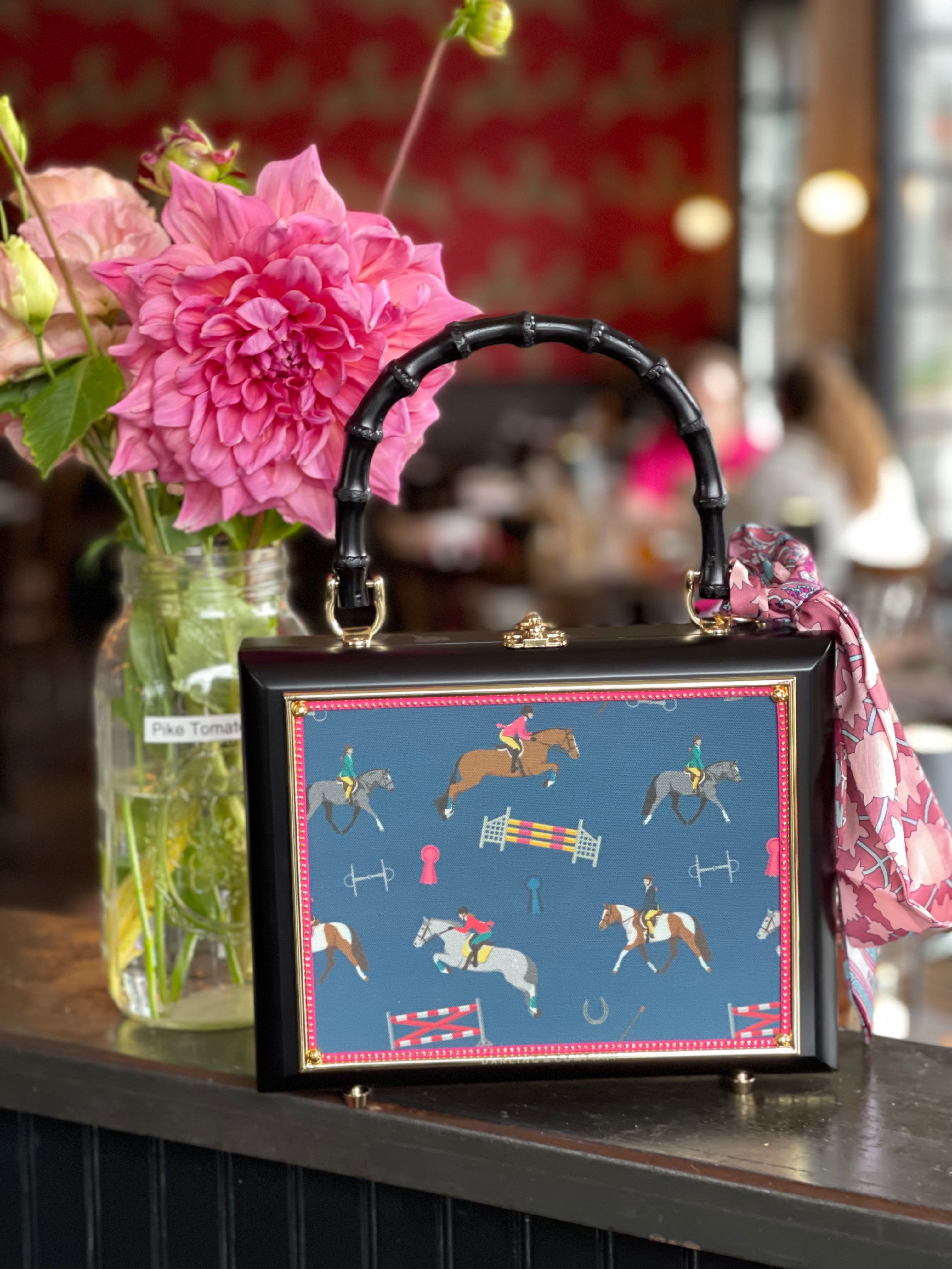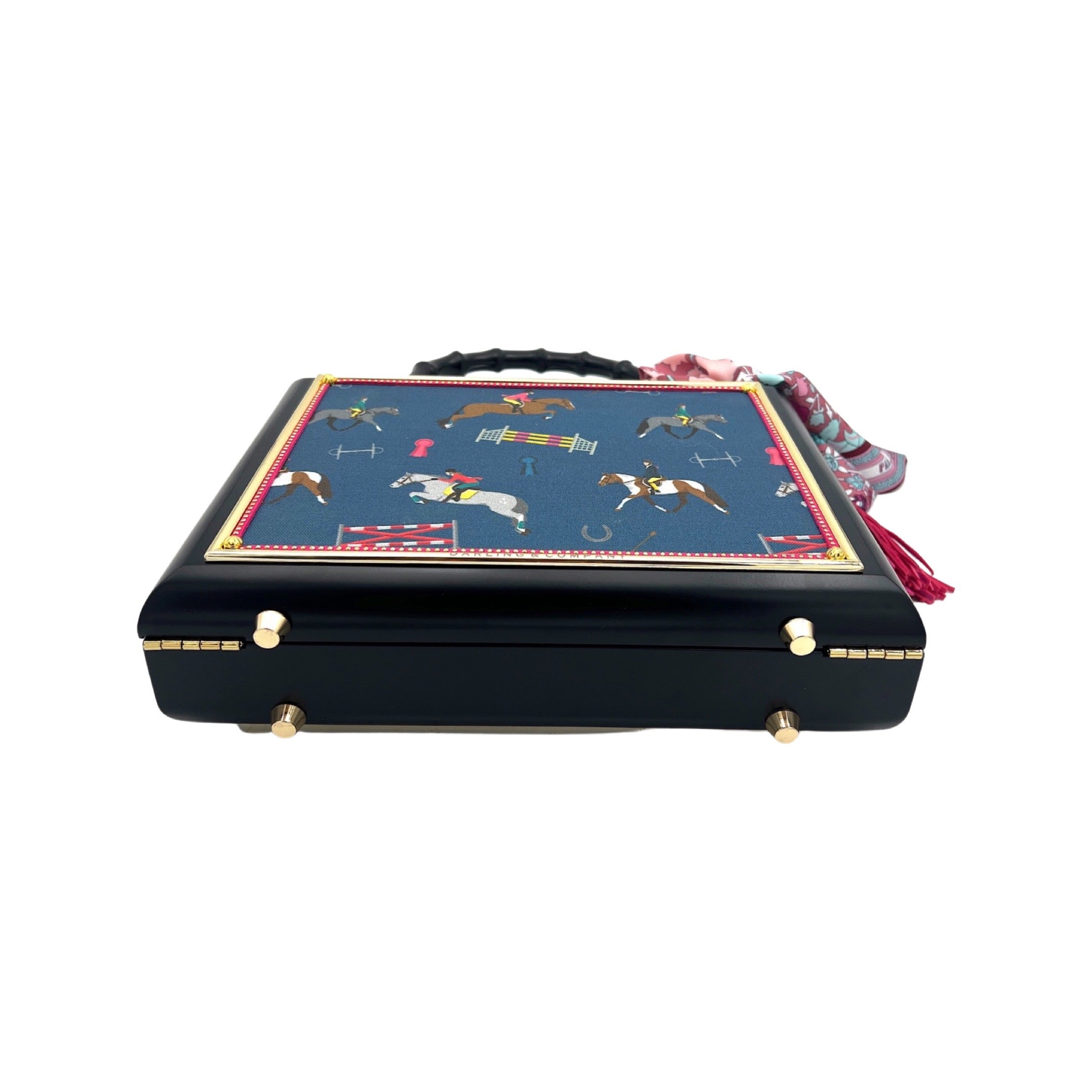 Details include: black mahogany box, skinny scarf, tassel dangling from black bamboo handle, and acid-protected hardware (clasp, hinges, and purse feet) have been added. Interior is finished with a velvety liner, pocket, and small mirror. The box is a durable, sable-stained mahogany.