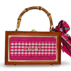 Features: polo toile fabric in magenta on the front; the back features a magenta pink suede fabric with a gold horse bit atop a pink and white gingham ribbon, finished with our signature riveted suede trim