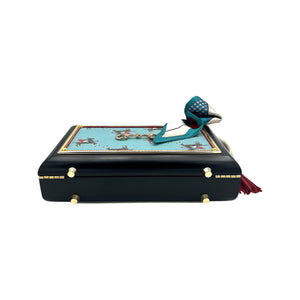 Other details include: skinny scarf, tassel dangling from black bamboo handle, and acid-protected hardware (clasp, hinges, and purse feet) have been added. Interior is finished with a velvety liner, pocket, and small mirror. The box is a durable, black-glazed mahogany.