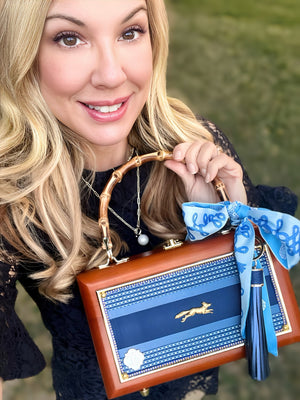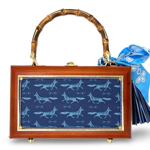 Features: two-toned blue fox and horse bit fabric on the front; the back features a blue fabric with a navy ribbon and gold fox bauble, finished with our riveted suede trim