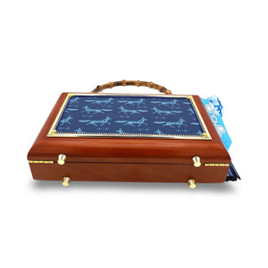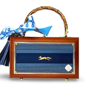 Other details include: skinny scarf, tassel dangling from burnt bamboo handle, and acid-protected hardware (clasp, hinges, and purse feet) have been added. Interior is finished with a velvety liner, pocket, and small mirror. The box is a durable, sable-stained mahogany.