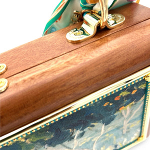 Other details include: skinny scarf, tassel dangling from burnt bamboo handle, and acid-protected hardware (clasp, hinges, and purse feet) have been added. Interior is finished with a velvety liner, pocket, and small mirror. The box is a durable, sable-stained mahogany.