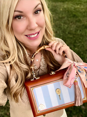 Other details include: skinny scarf, tassel dangling from burnt bamboo handle, and acid-protected hardware (clasp, hinges, and purse feet) have been added. Interior is finished with a velvety liner, pocket, and small mirror. The box is a durable, sable-stained mahogany.
