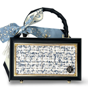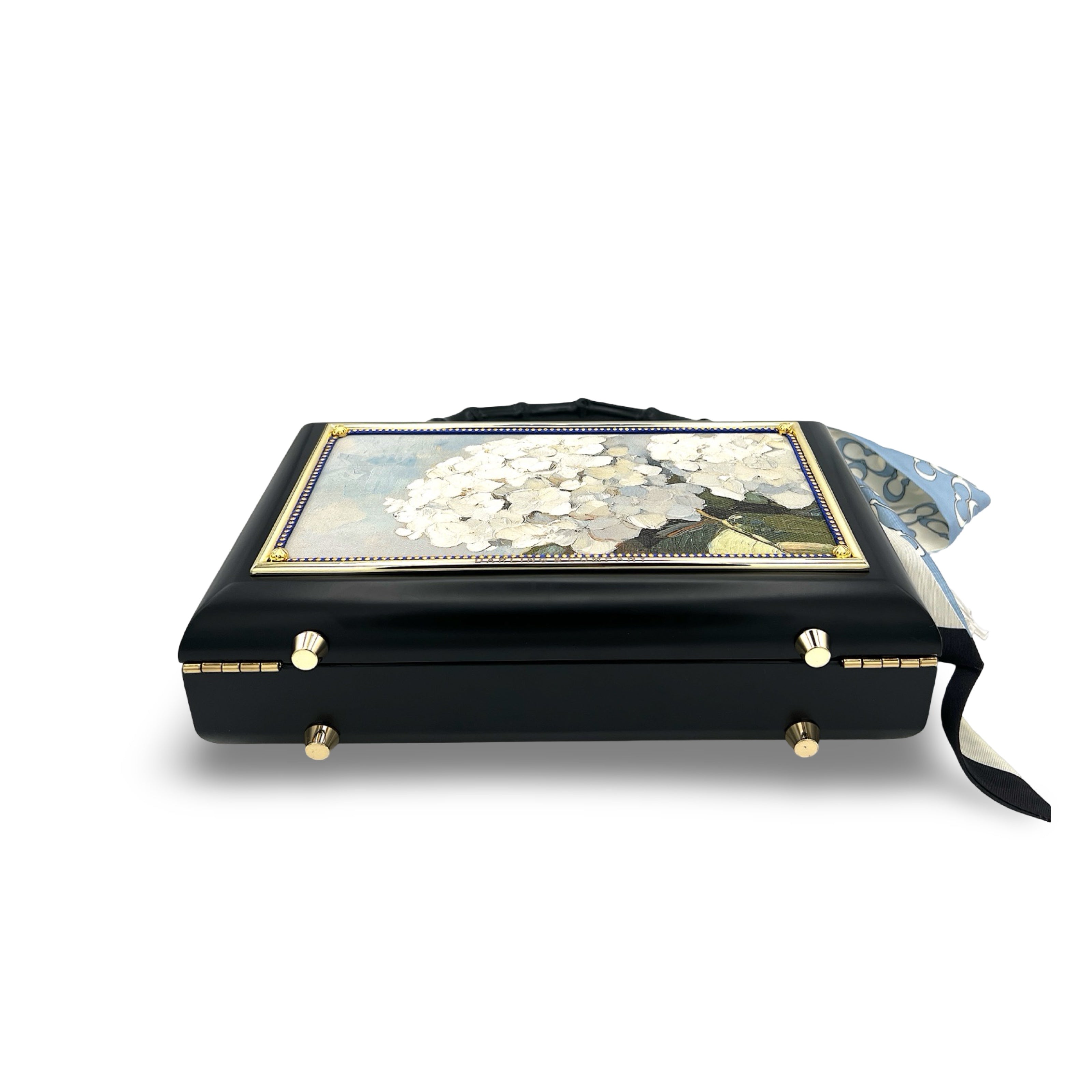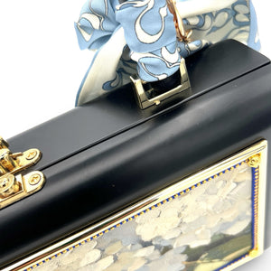 Other details include: skinny scarf, tassel dangling from blackbamboo handle, and acid-protected hardware (clasp, hinges, and purse feet) have been added. Interior is finished with a velvety liner, pocket, and small mirror. The box is a durable, black-glazed mahogany.
