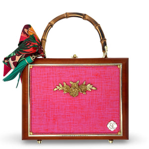 Other details include: skinny scarf, tassel dangling from burnt bamboo handle, and acid-protected hardware (clasp, hinges, and purse feet) have been added. Interior is finished with a velvety liner, pocket, and small mirror. The box is a durable, sable-stained mahogany.