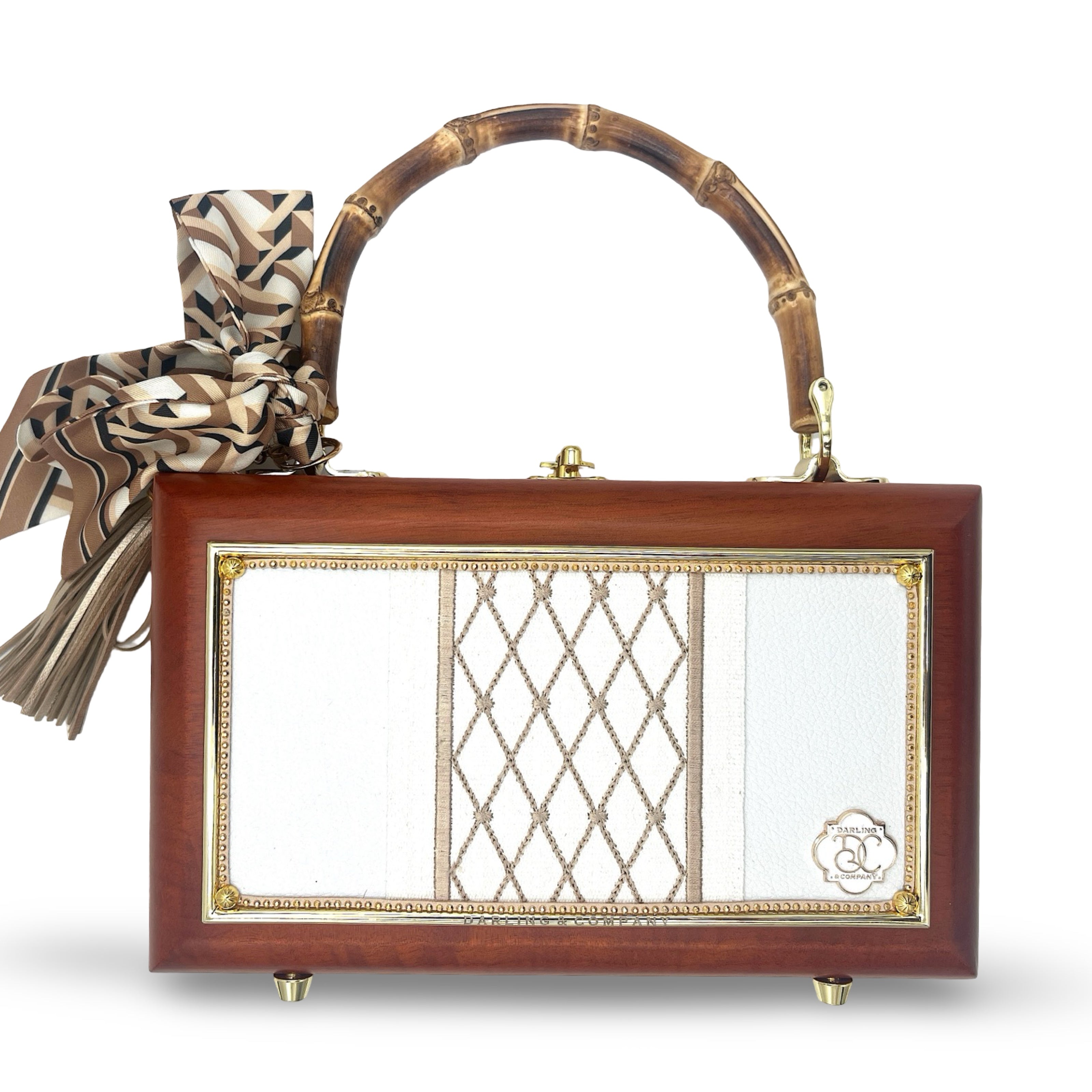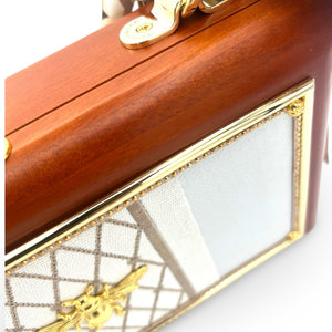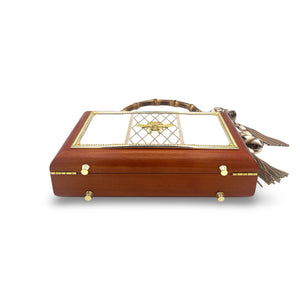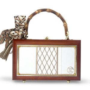 Other details include: skinny scarf, tassel dangling from burnt bamboo handle, and acid-protected hardware (clasp, hinges, and purse feet) have been added. Interior is finished with a velvety liner, pocket, and small mirror. The box is a durable, sable-stained mahogany.
