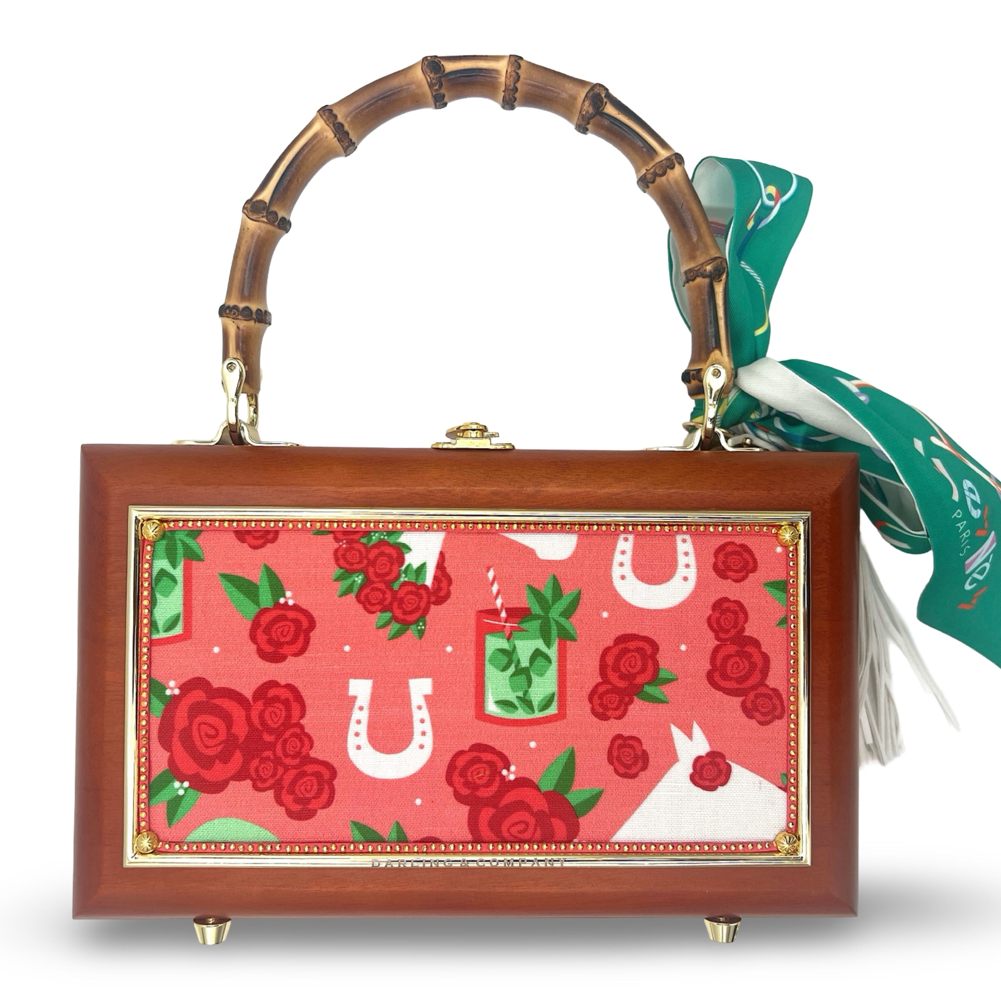Other details include: skinny scarf, tassel dangling from burnt bamboo handle, and acid-protected hardware (clasp, hinges, and purse feet) have been added. Interior is finished with a velvety liner, pocket, and small mirror. The box is a durable, sable-stained mahogany.