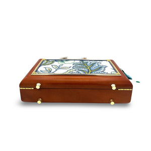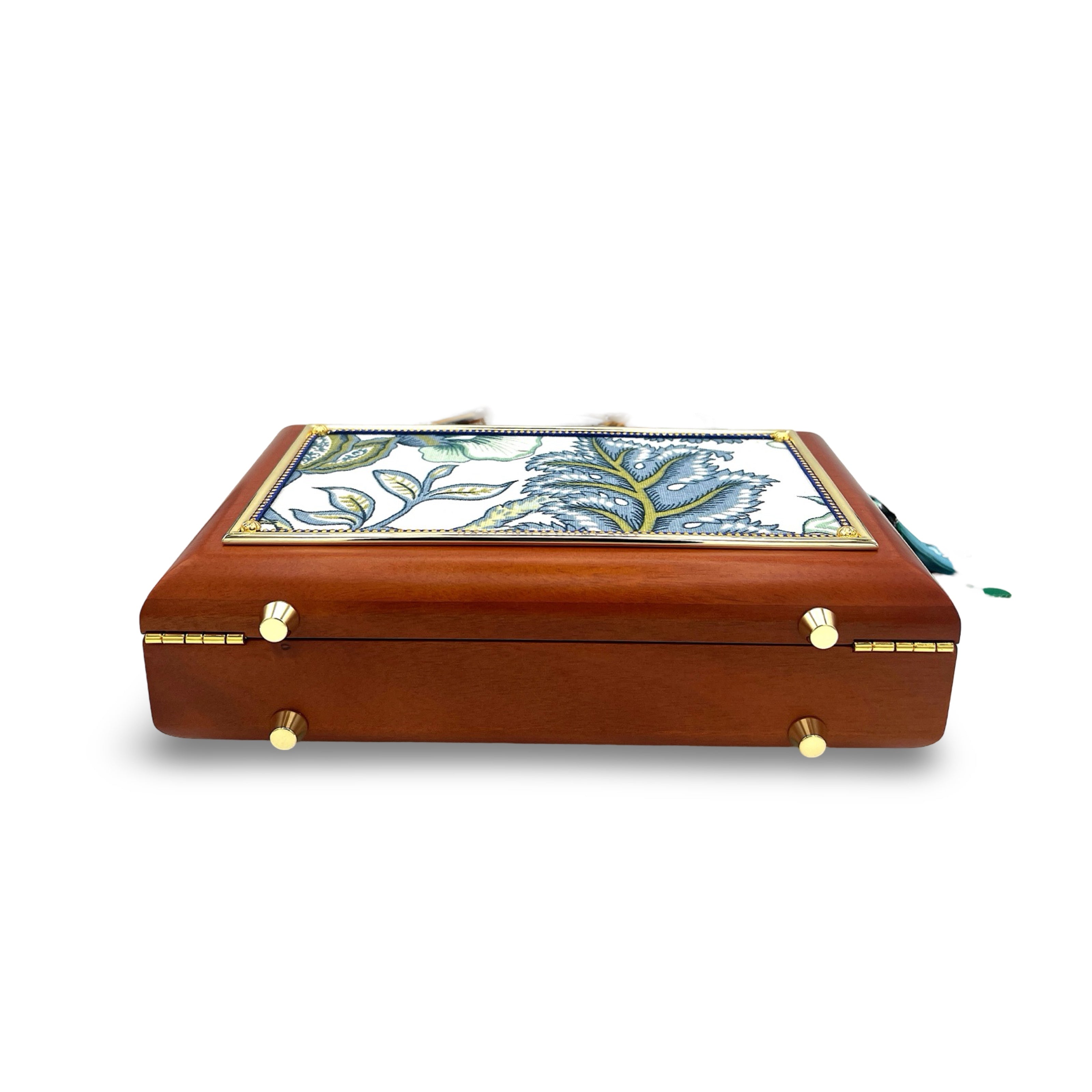 Other details include: skinny scarf, tassel dangling from burnt bamboo handle, and acid-protected hardware (clasp, hinges, and purse feet) have been added. Interior is finished with a velvety liner, pocket, and small mirror. The box is a durable, sable-stained mahogany.