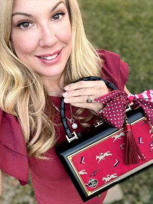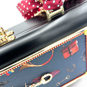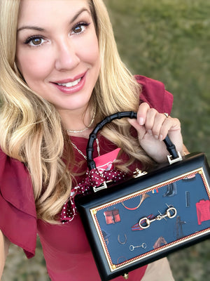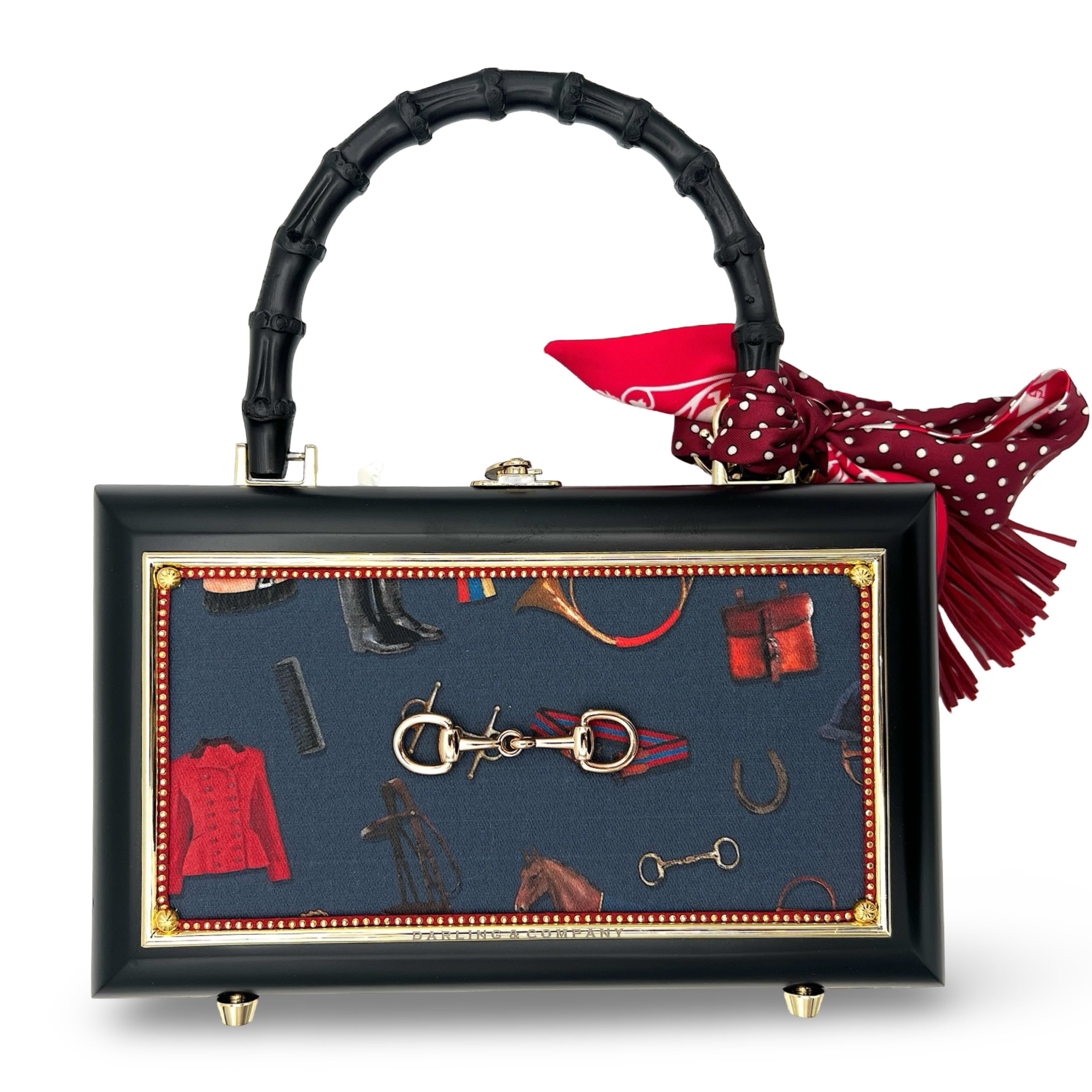 Features: equestrian-themed blue fabric on the front with a gold horse bit; the back features a deep red equestrian fabric, finished with our riveted suede trim
