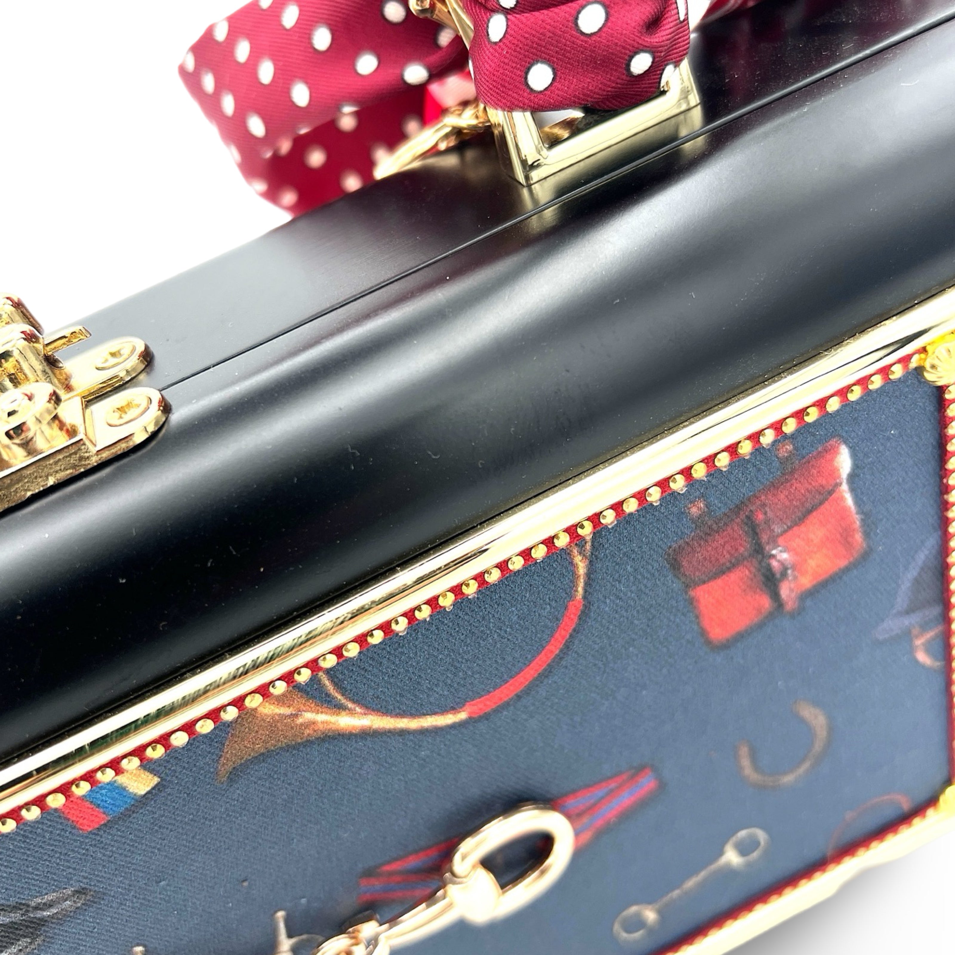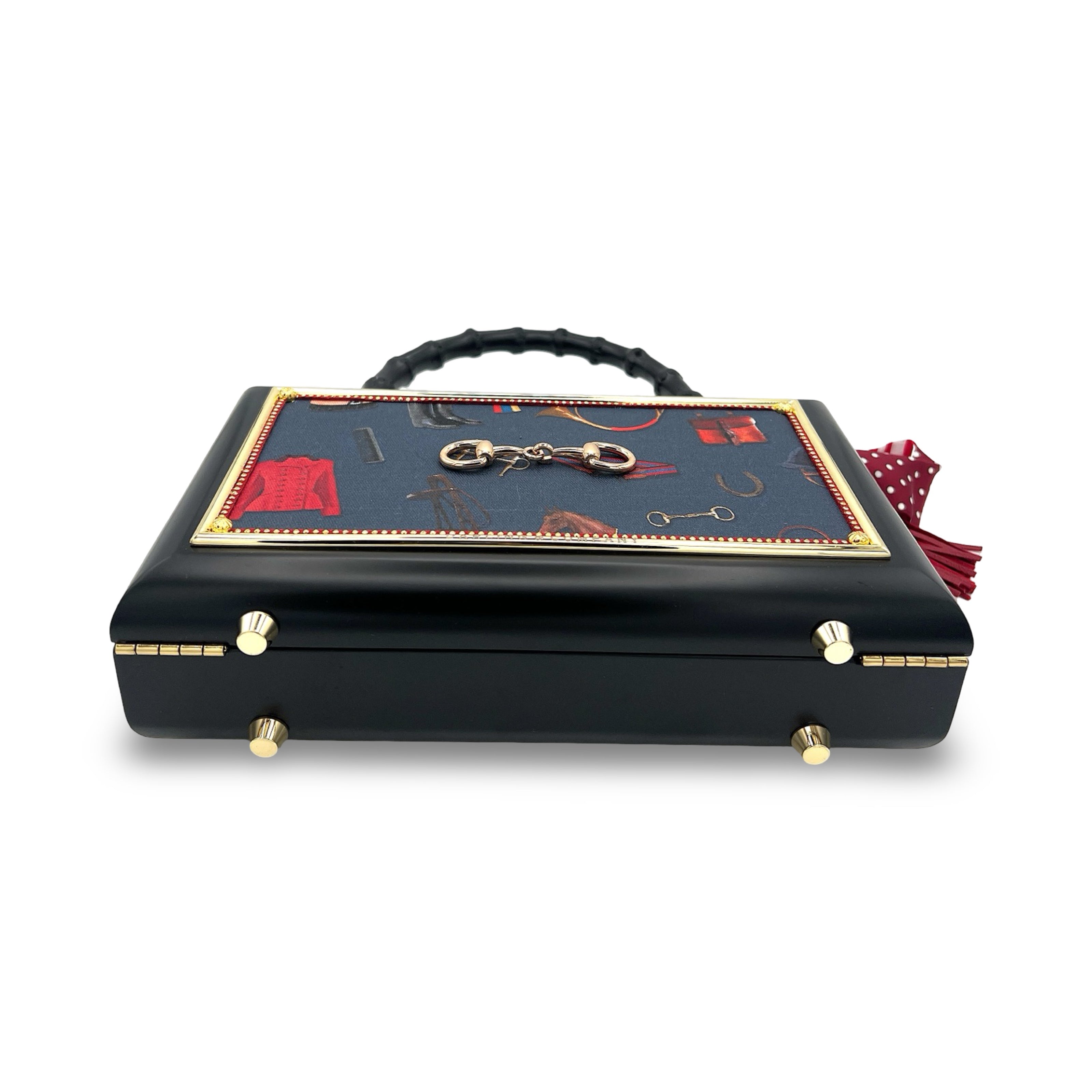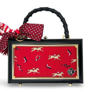 Other details include: skinny scarf, tassel dangling from black bamboo handle, and acid-protected hardware (clasp, hinges, and purse feet) have been added. Interior is finished with a velvety liner, pocket, and small mirror. The box is a durable, black-glazed mahogany.
