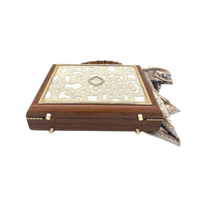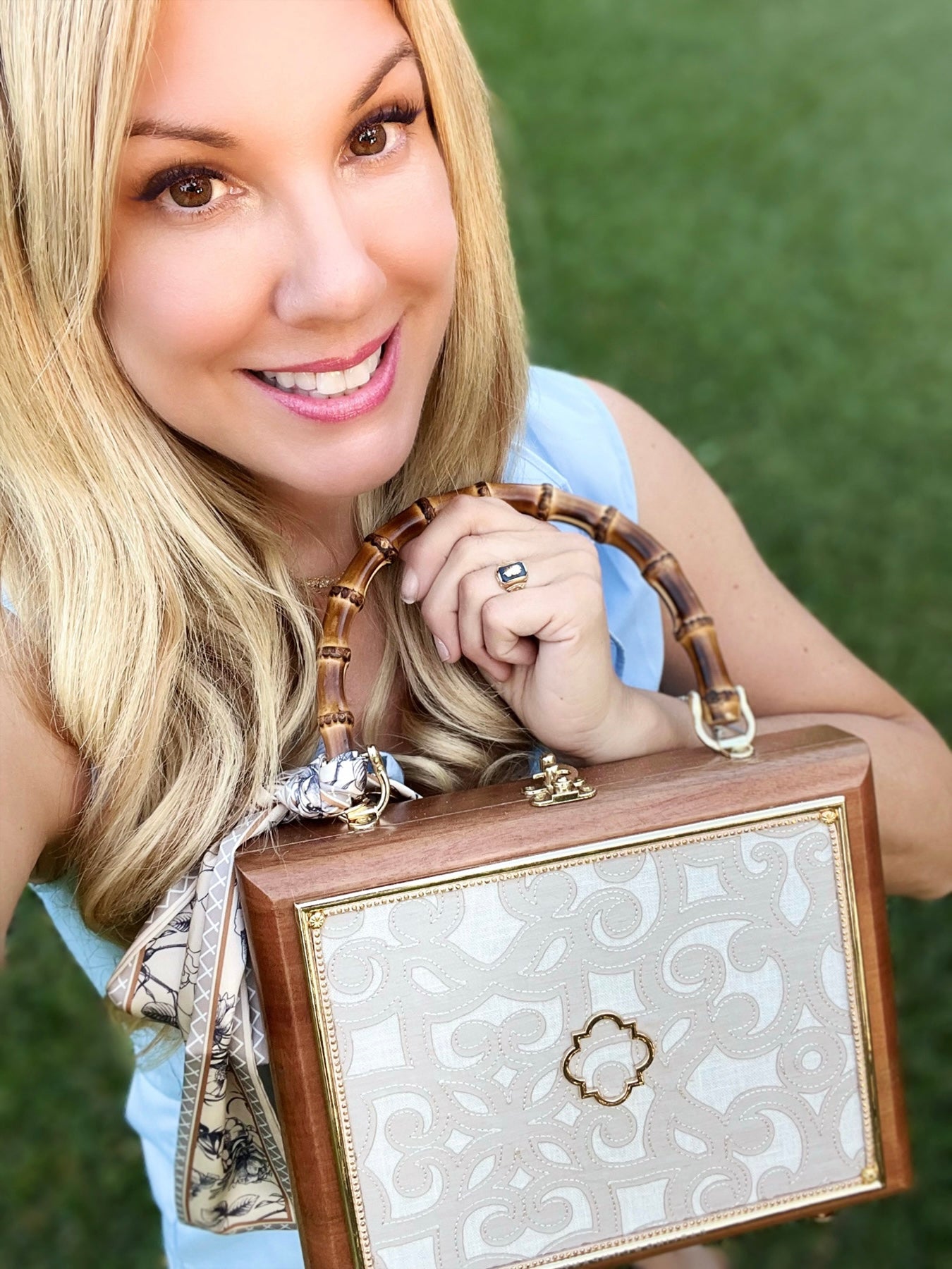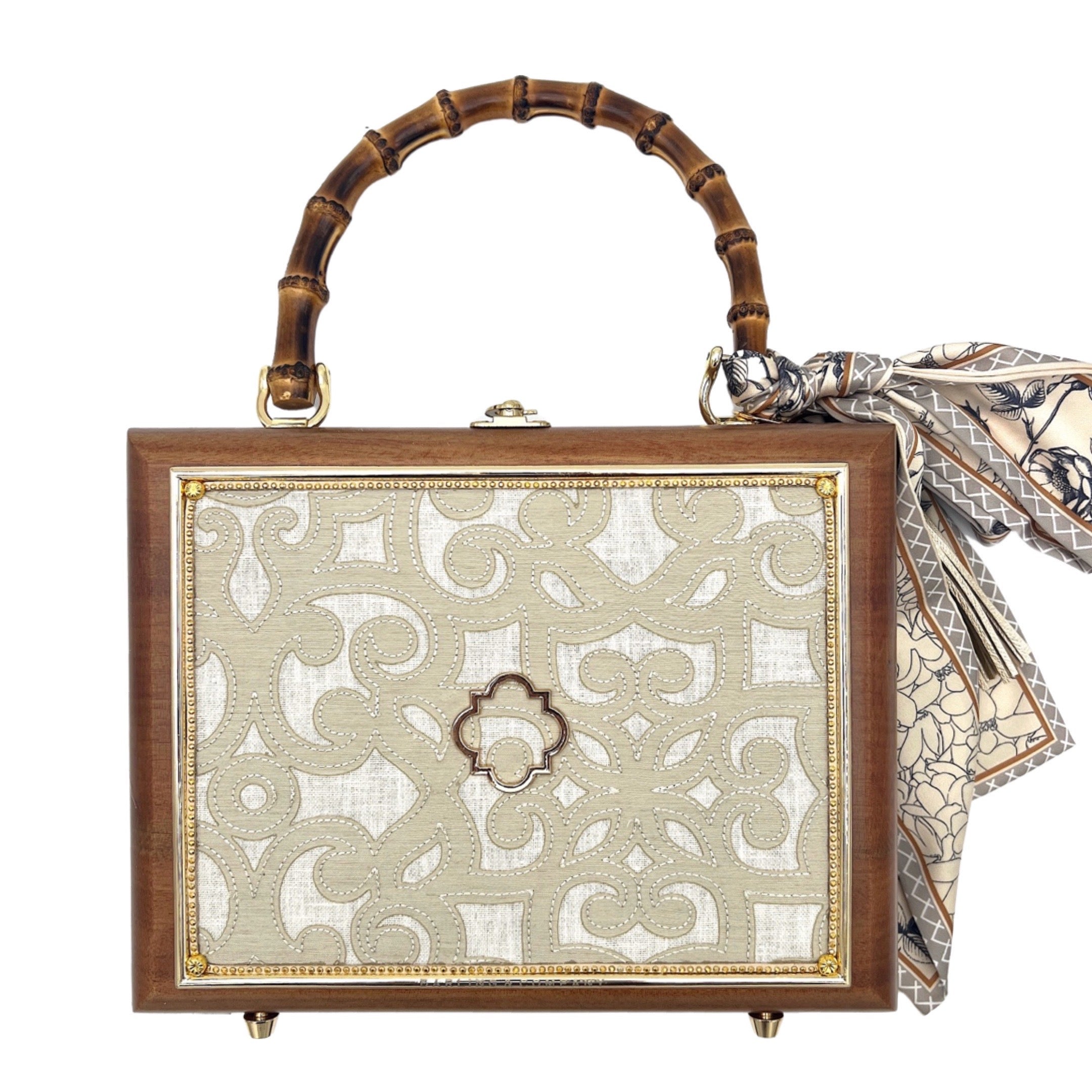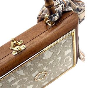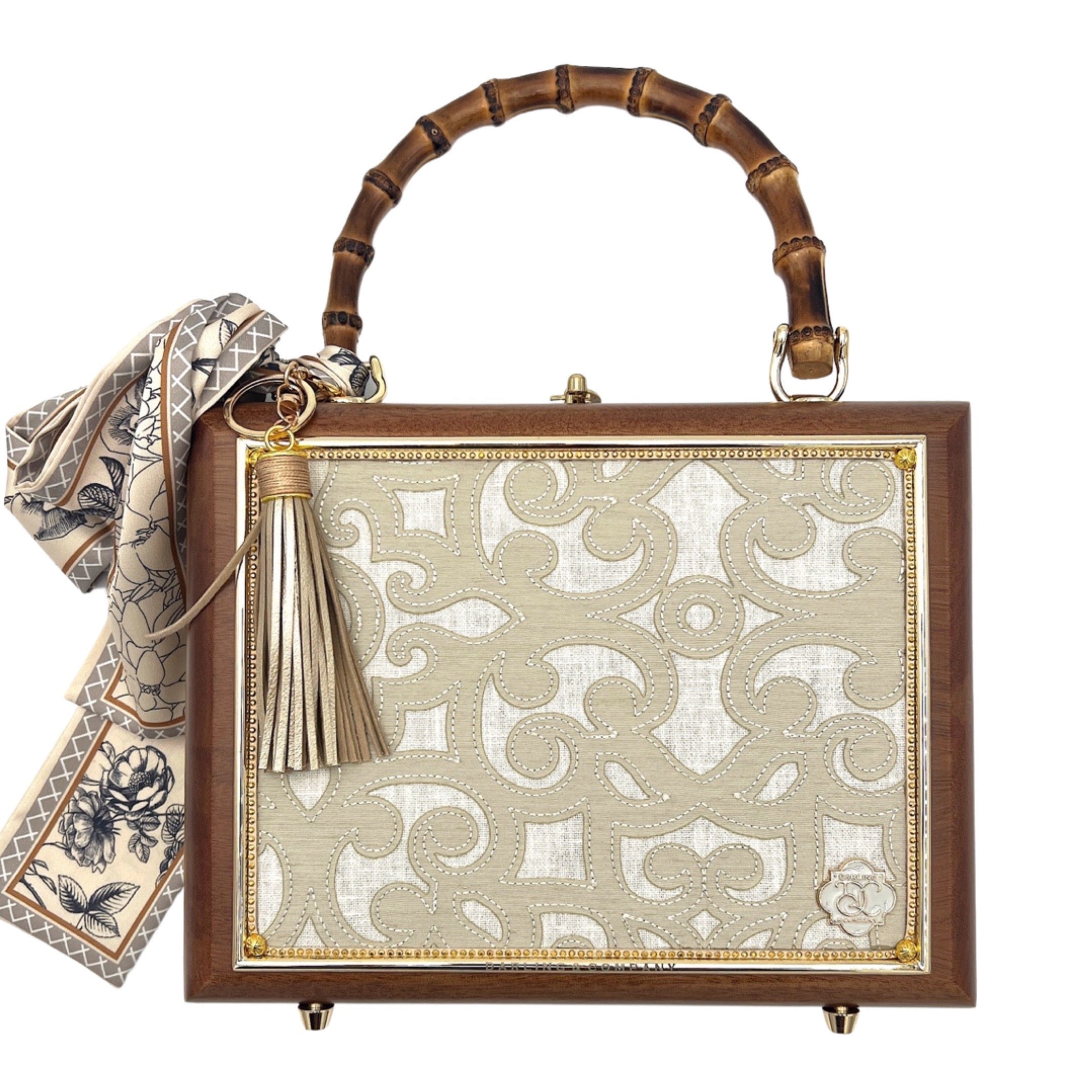 Details include: Mahogany cigar box, skinny scarf, tassel dangling from burnt bamboo handle, and acid-protected hardware (clasp, hinges, and purse feet) have been added. Interior is finished with a velvety liner, pocket, and small mirror. The box is a durable, sable-stained mahogany.