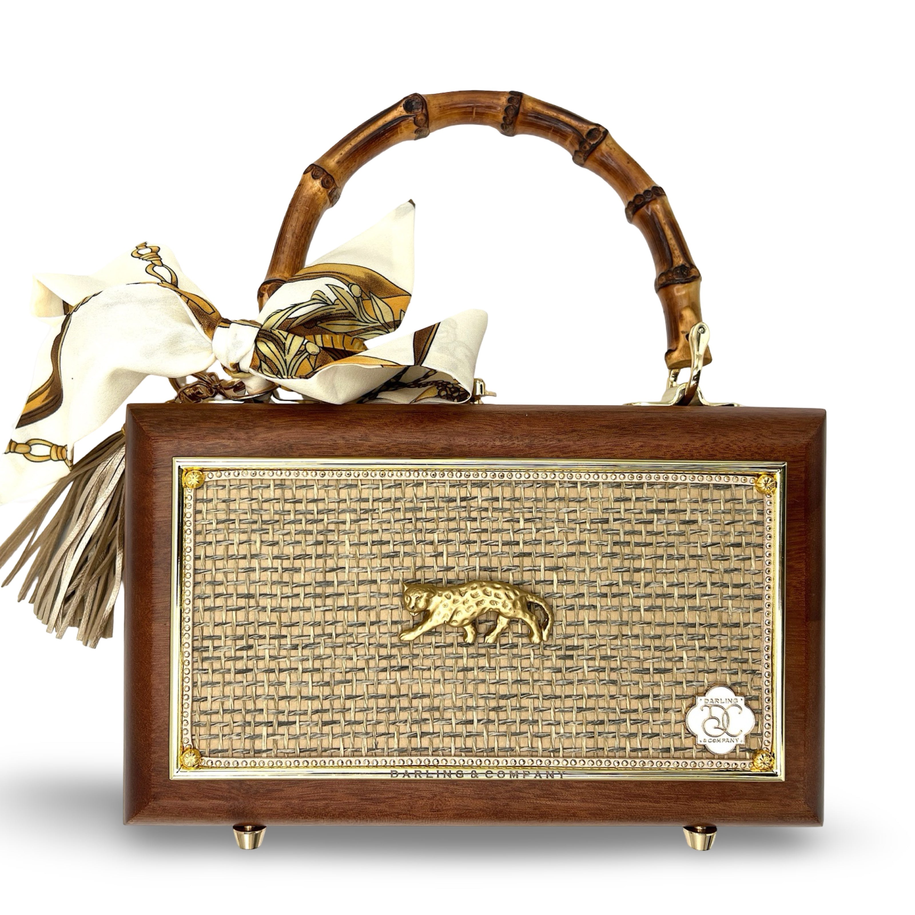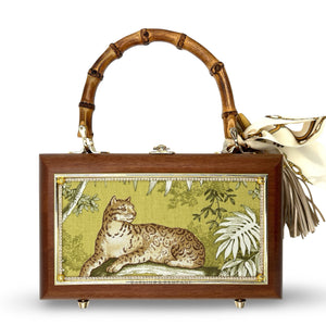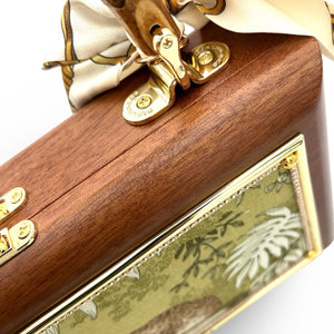 Other details include: skinny scarf, tassel dangling from burnt bamboo handle, and acid-protected hardware (clasp, hinges, and purse feet) have been added. Interior is finished with a velvety liner, pocket, and small mirror. The box is a durable, sable-stained mahogany.