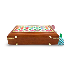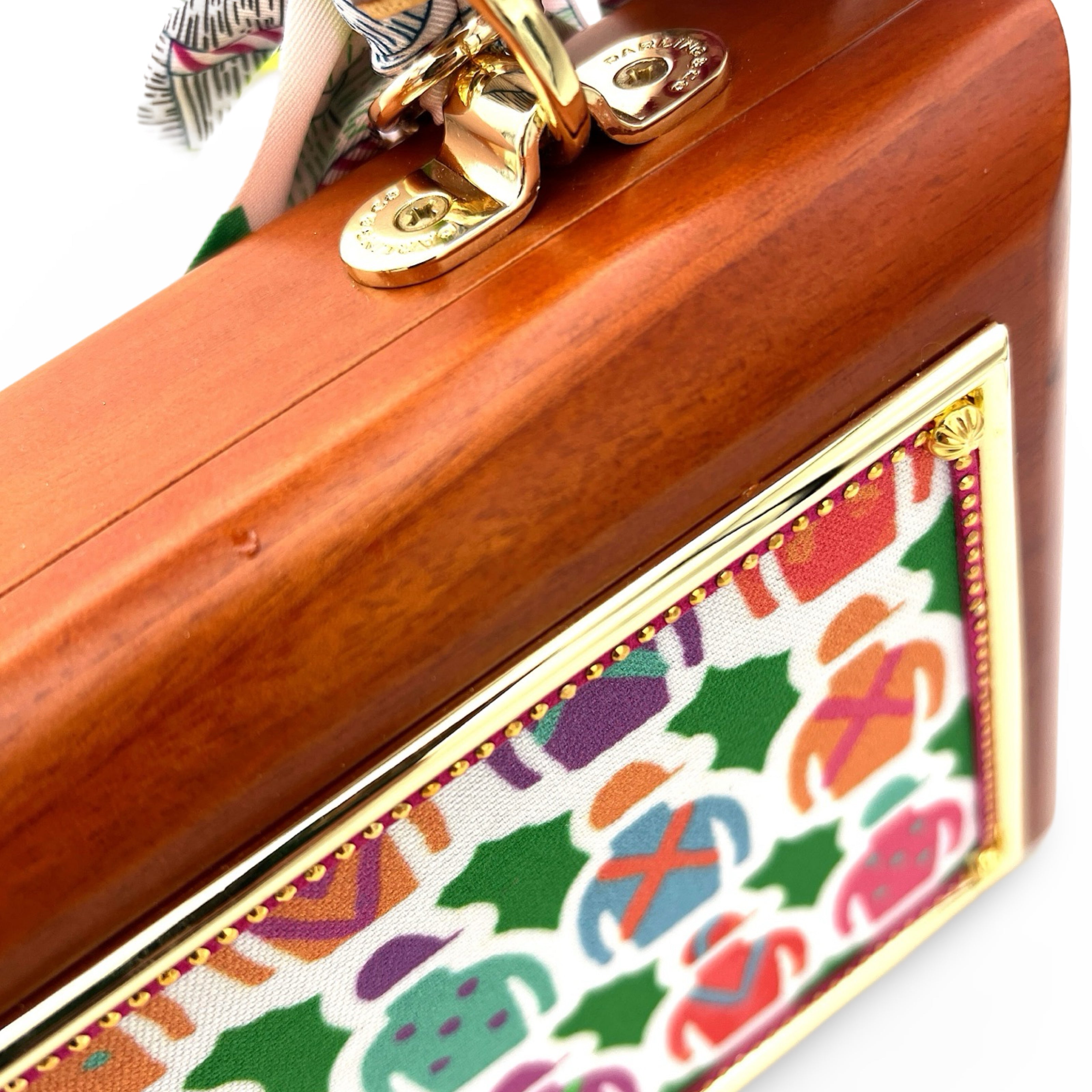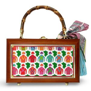 Other details include: skinny scarf, tassel dangling from burnt bamboo handle, and acid-protected hardware (clasp, hinges, and purse feet) have been added. Interior is finished with a velvety liner, pocket, and small mirror. The box is a durable, sable-stained mahogany.
