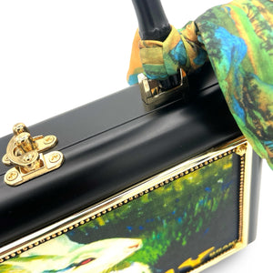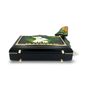 Other details include: skinny scarf, tassel dangling from black bamboo handle, and acid-protected hardware (clasp, hinges, and purse feet) have been added. Interior is finished with a velvety liner, pocket, and small mirror. The box is a durable, black-glazed mahogany.