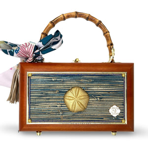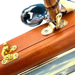 Other details include: skinny scarf, tassel dangling from burnt bamboo handle, and acid-protected hardware (clasp, hinges, and purse feet) have been added. Interior is finished with a velvety liner, pocket, and small mirror. The box is a durable, sable-stained mahogany.