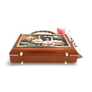 Other details include: skinny scarf, tassel dangling from burnt bamboo handle, and acid-protected hardware (clasp, hinges, and purse feet) have been added. Interior is finished with a velvety liner, pocket, and small mirror. The box is a durable, sable-stained mahogany.