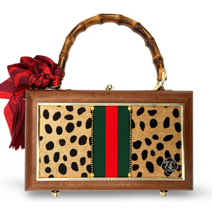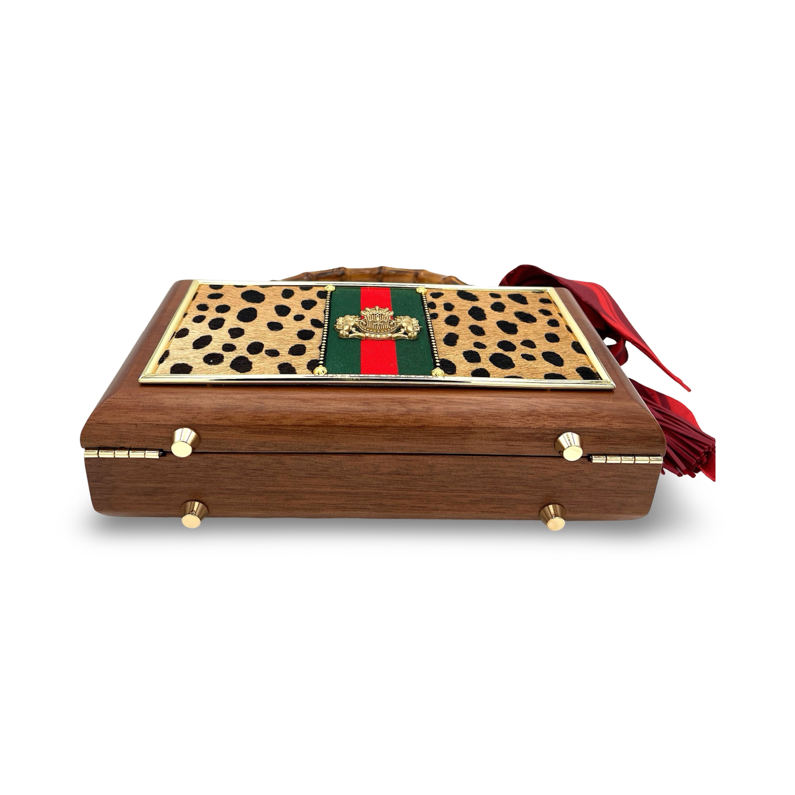 Other details include: skinny scarf, tassel dangling from burnt bamboo handle, and acid-protected hardware (clasp, hinges, and purse feet) have been added. Interior is finished with a velvety liner, pocket, and small mirror. The box is a durable, sable-stained mahogany.