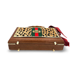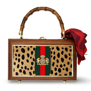 Features: cheetah print on hair on cowhide with a green and red striped ribbon on both sides; front features a gold crest bauble, finished with our riveted suede trim